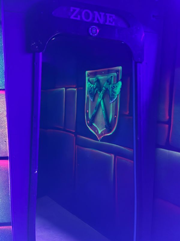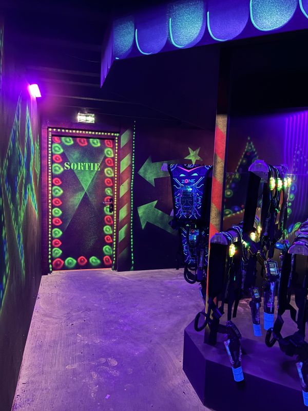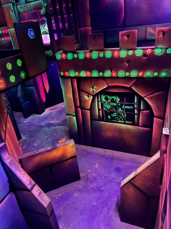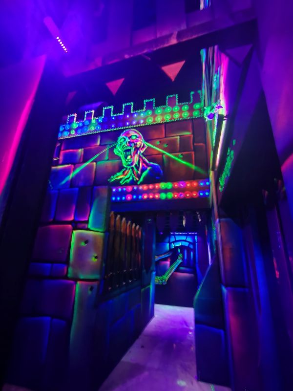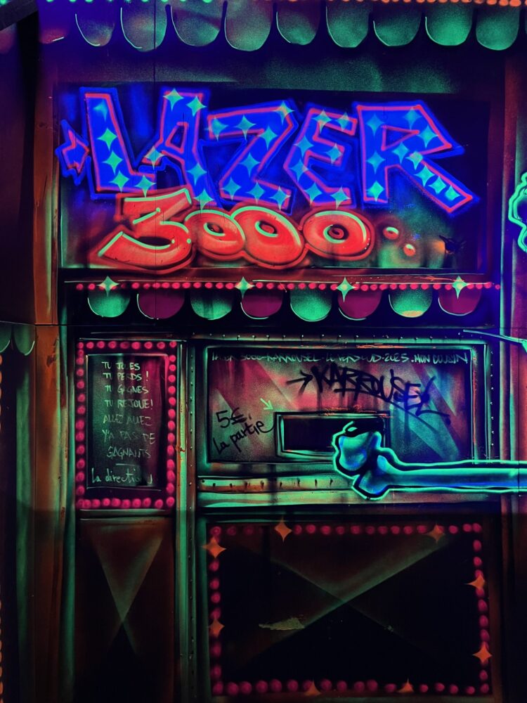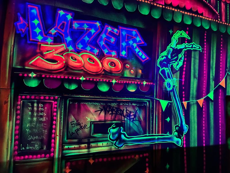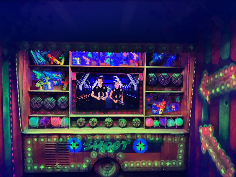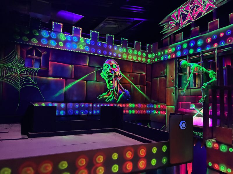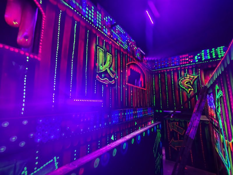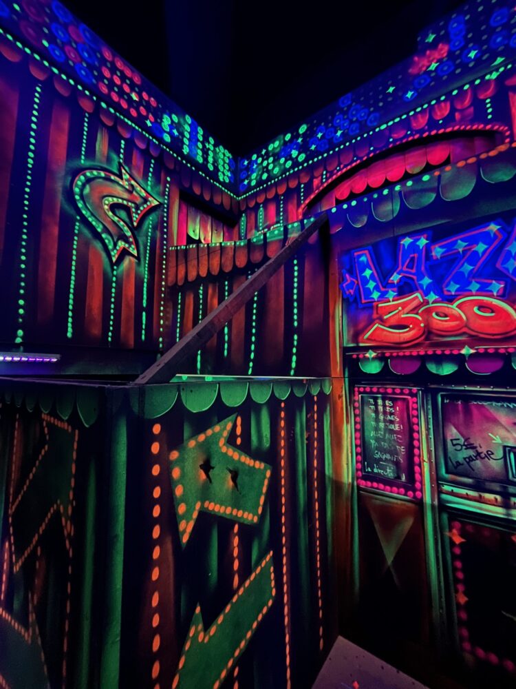 Le centre Karrousel de Versoud, ouvert en Décembre 2025, souhaitait intégrer dans son offre de plus d'une dizaine d'activités une arène laser game entièrement thématisée autour de l’univers forain. Le client a réalisé lui-même la structure du labyrinthe à partir de nos plans détaillés et des recommandations techniques, tandis que notre équipe assurait la direction artistique, l’ensemble du travail décoratif et la fourniture et l'installation des équipements laser. L’objectif : créer une arène à plusieurs univers forts, chacun inspiré d’une attraction ou élément emblématiques des fêtes foraines — palais des glaces, fun house, maison hantée, roulottes.