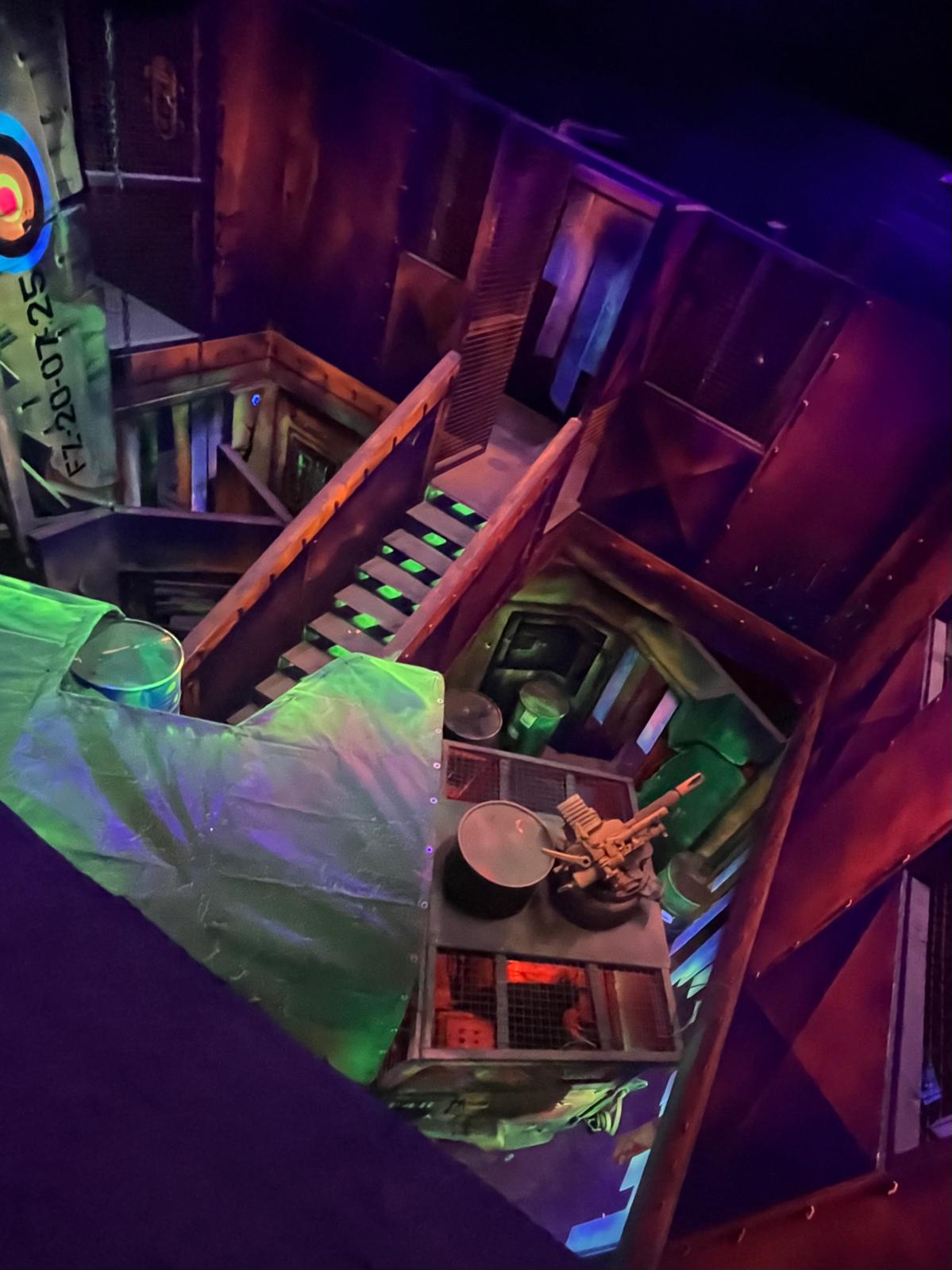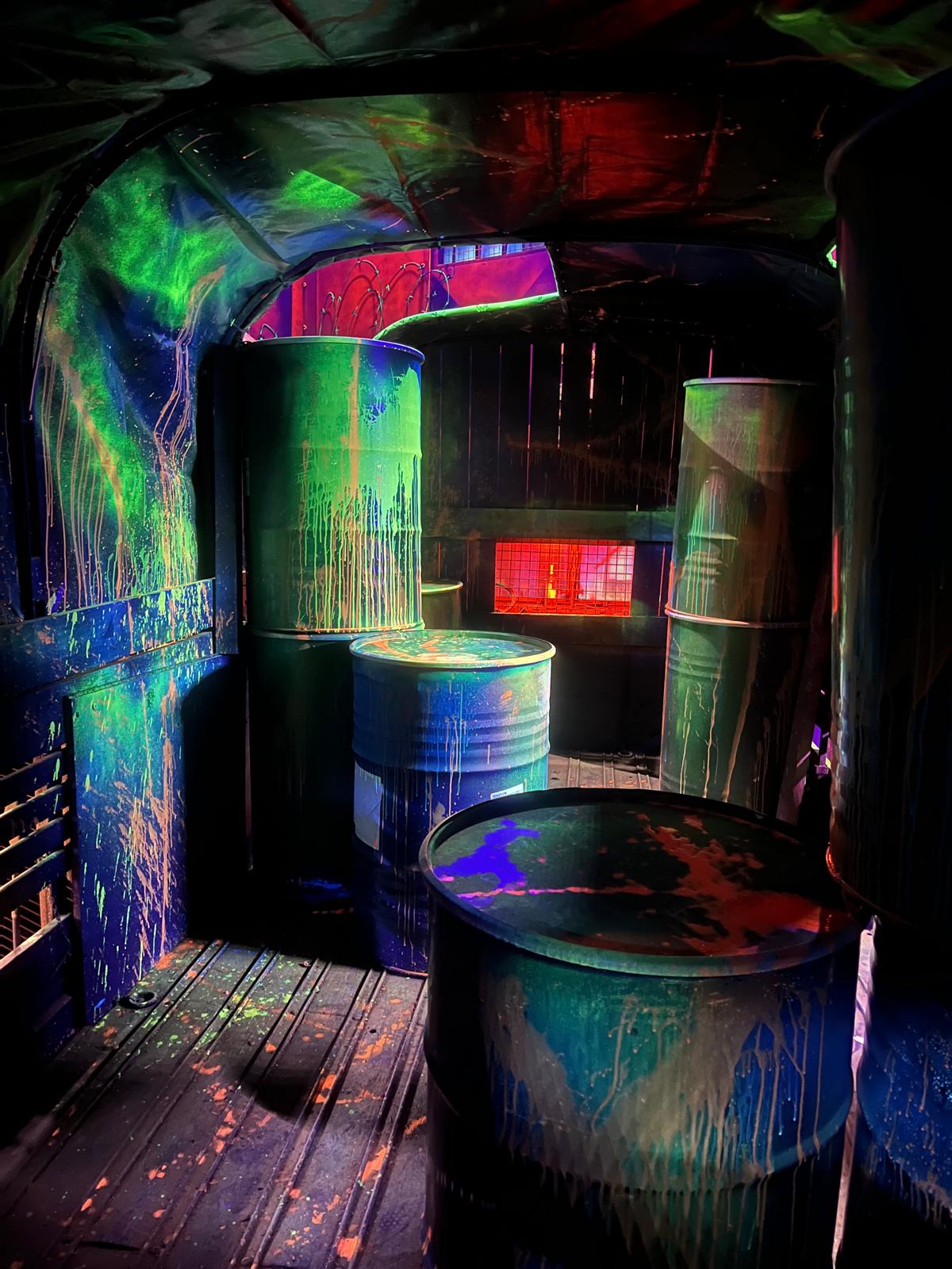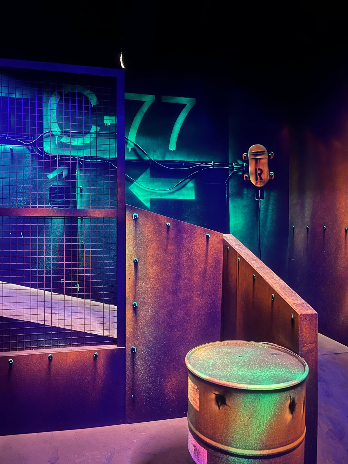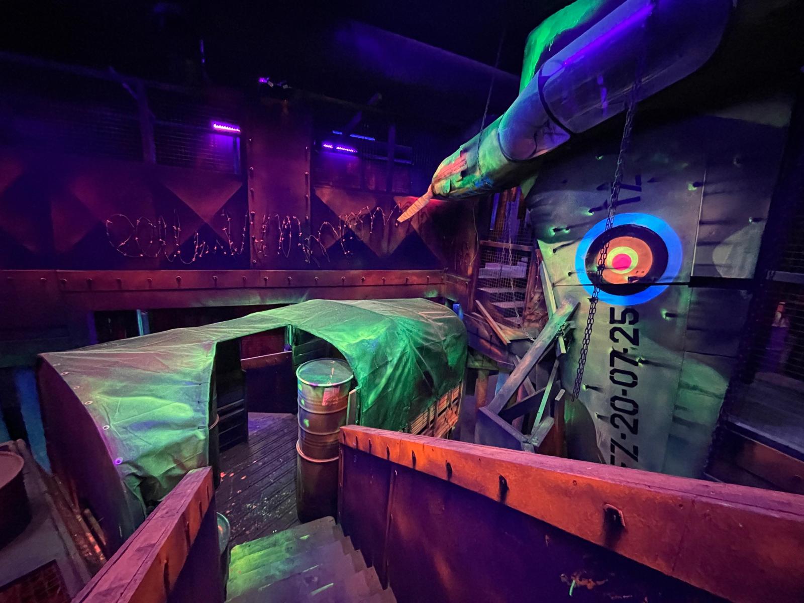 Pour la décoration, le parti pris fut d’éviter les fresques figuratives directement liées à la guerre ou à des scènes trop martiales. L’objectif était plutôt de magnifier l’architecture du labyrinthe grâce à un jeu de trompe-l’œil, de textures et de couleurs UV, tout en valorisant les différents éléments rapportés. Le décor repose donc sur : une palette lumineuse cohérente, des façades stylisées, des détails peints au pochoir, des marquages industriels, et un travail de relief permettant de renforcer l’impression d’immersion.