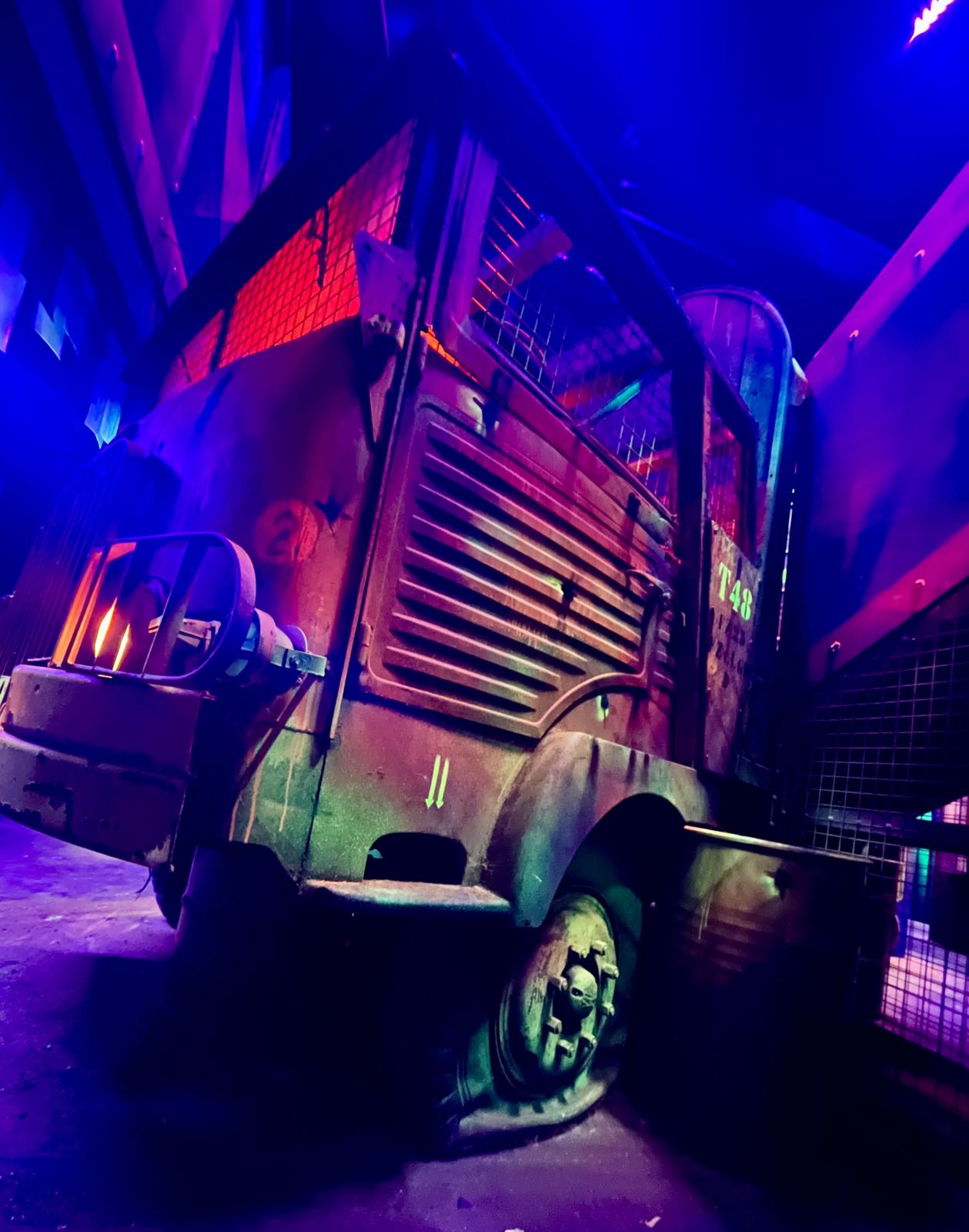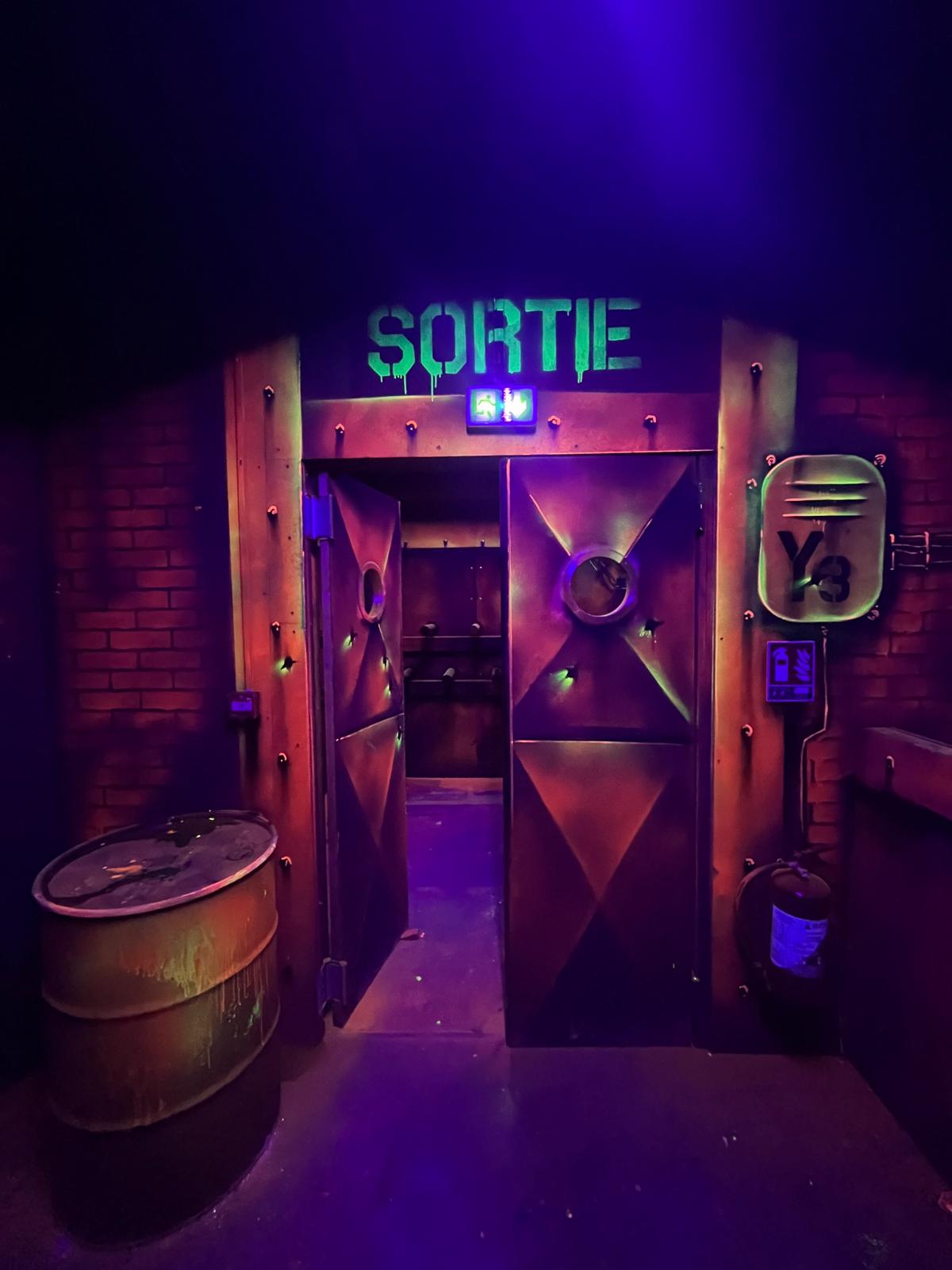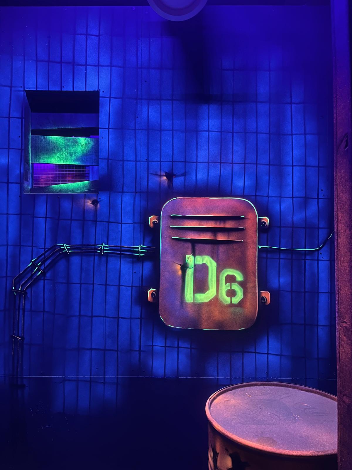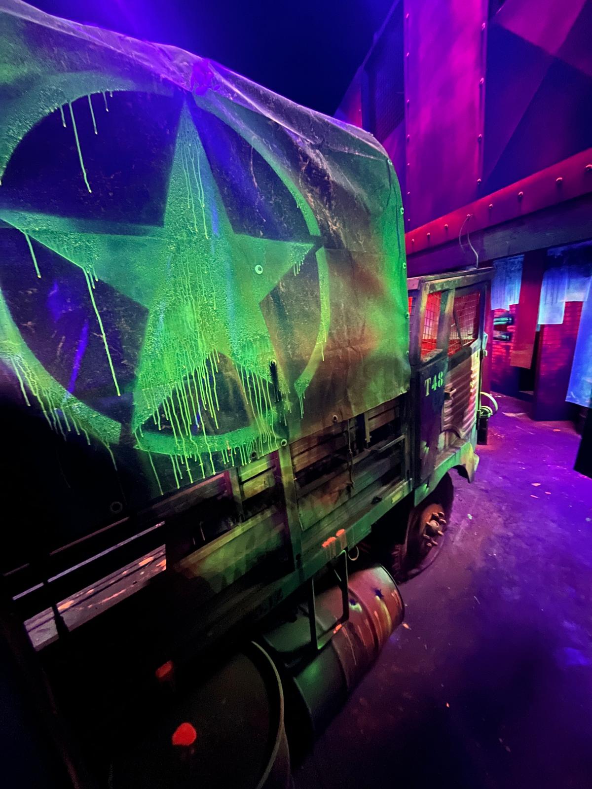 Pour la décoration, le parti pris fut d’éviter les fresques figuratives directement liées à la guerre ou à des scènes trop martiales. L’objectif était plutôt de magnifier l’architecture du labyrinthe grâce à un jeu de trompe-l’œil, de textures et de couleurs UV, tout en valorisant les différents éléments rapportés. Le décor repose donc sur : une palette lumineuse cohérente, des façades stylisées, des détails peints au pochoir, des marquages industriels, et un travail de relief permettant de renforcer l’impression d’immersion.
