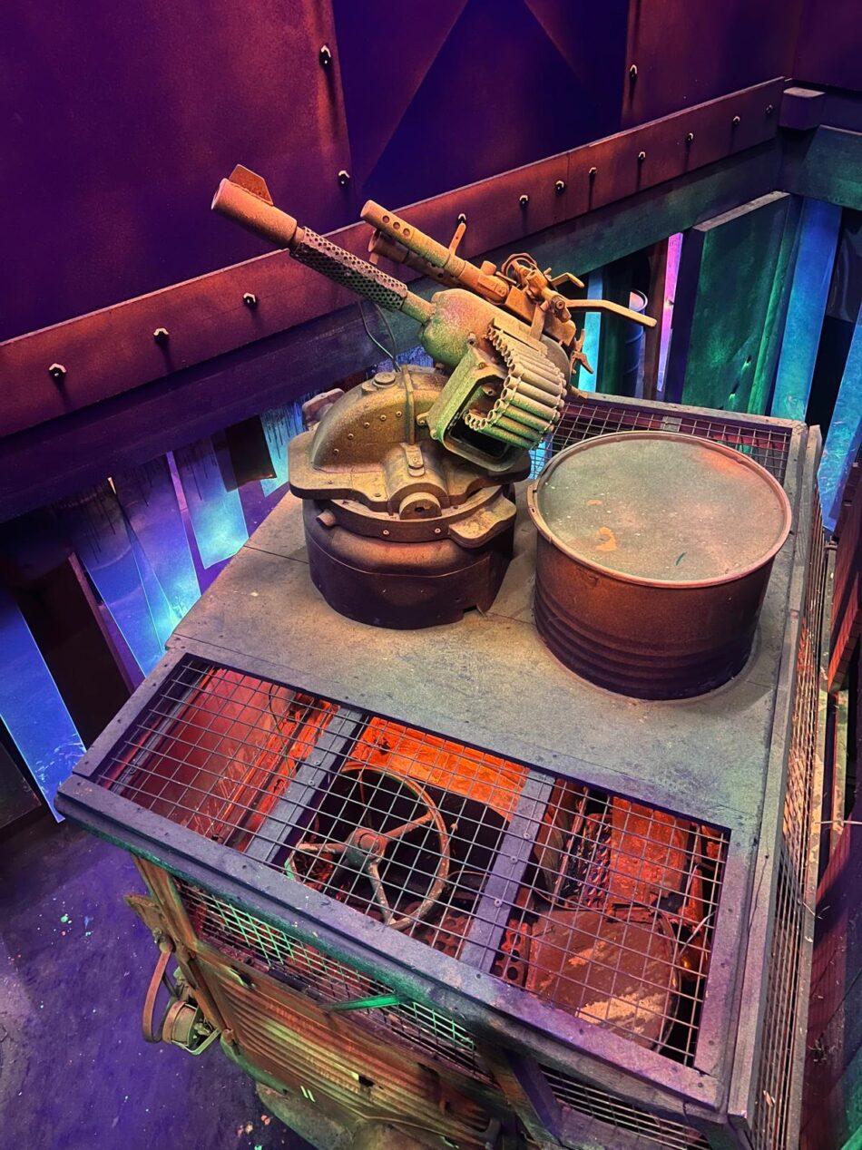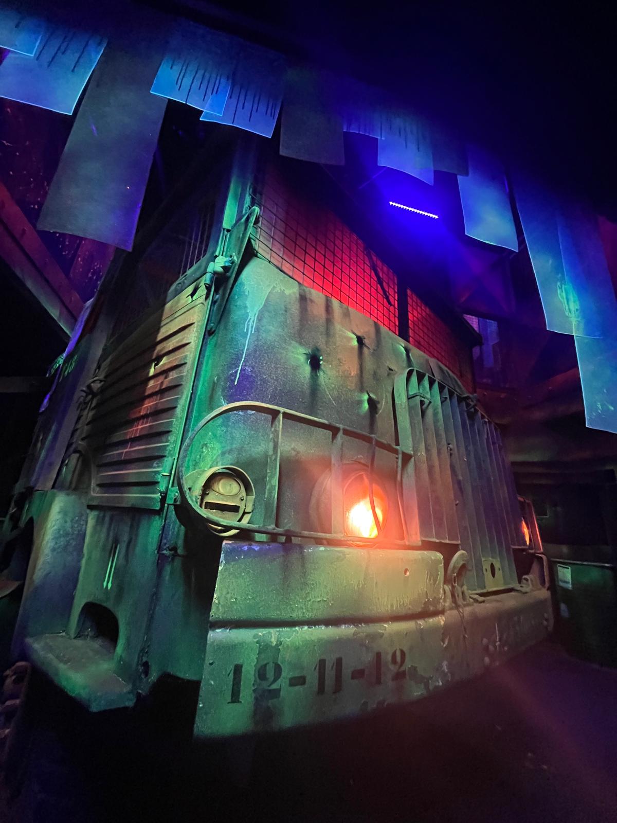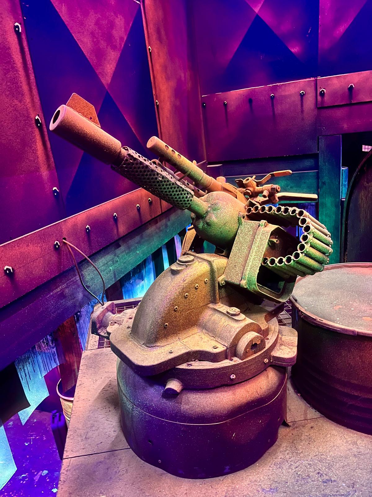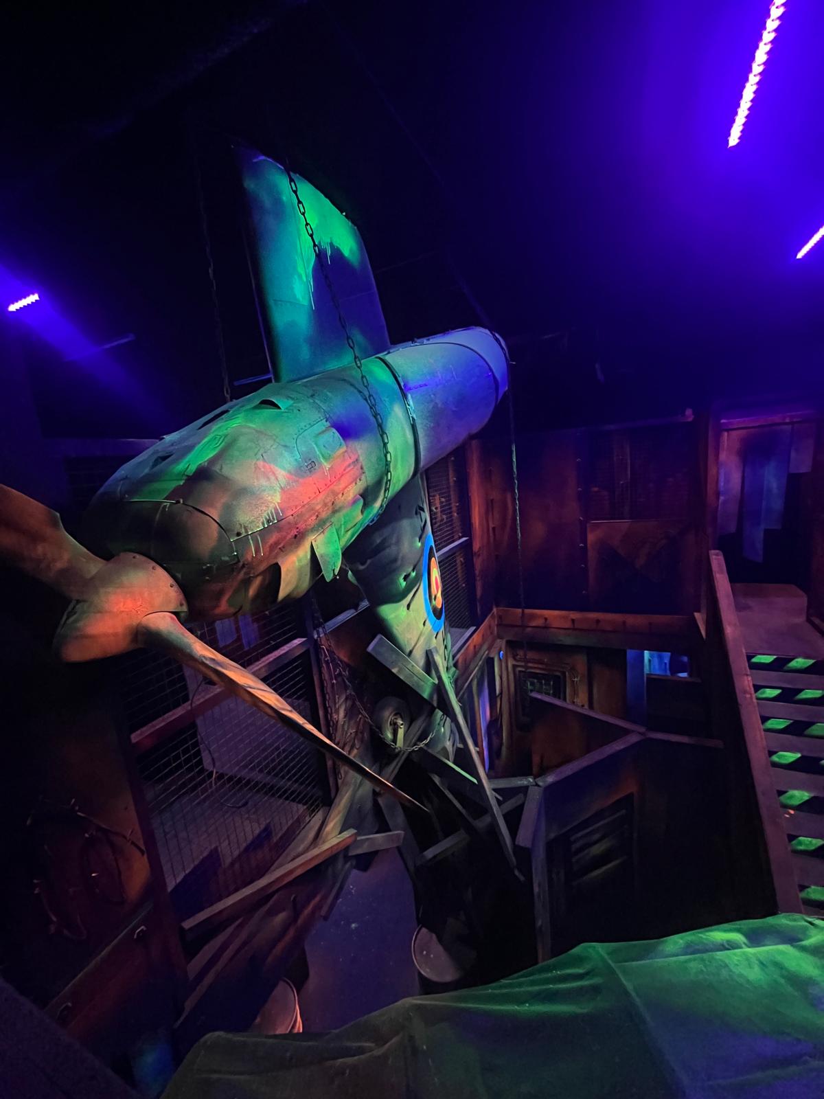 Pour la décoration, le parti pris fut d’éviter les fresques figuratives directement liées à la guerre ou à des scènes trop martiales. L’objectif était plutôt de magnifier l’architecture du labyrinthe grâce à un jeu de trompe-l’œil, de textures et de couleurs UV, tout en valorisant les différents éléments rapportés. Le décor repose donc sur : une palette lumineuse cohérente, des façades stylisées, des détails peints au pochoir, des marquages industriels, et un travail de relief permettant de renforcer l’impression d’immersion.